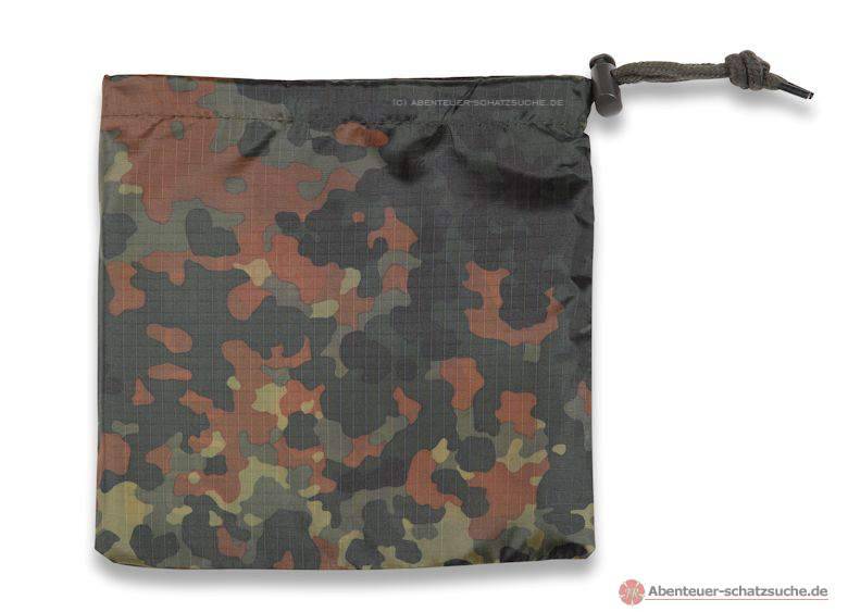 Mega practical and ultra light! Rain protection poncho in flecktarn. The poncho is very comfortable to wear. There is even enough space to carry a rucksack underneath. The arms can also be tucked underneath or into the sleeves.
