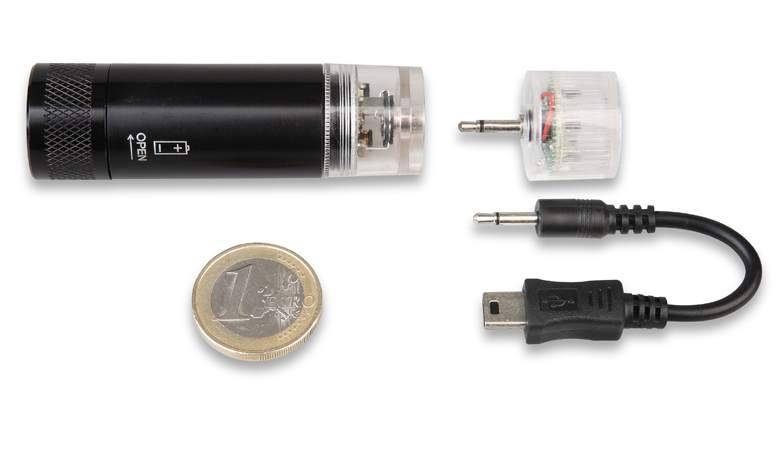 If you forget to charge the Deus remote control, the headset or the coil before a search, you can also use the emergency charger to recharge the interfaces in the field. You can charge the Deus via the MINI USB using a single standard AA 1.5 volt mignon battery inserted into the charger. Alternatively, a small LED attachment provides bright light off-road at all times.